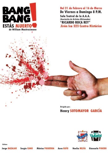 Bang BangActores: Jorge Bazalar, Aura Guío, Sergio Cano, Mónica Figueroa, Noelia Mejía y Giancarlo Pinedo. Director: Henry Sotomayor. Producción: Baúl de Esmerada. Lugar: Jr. Ica 323. Lima. Temporada: Del 21 de Febrero al 16 de marzo. Viernes, sábados y domingos 8:00 p.m.