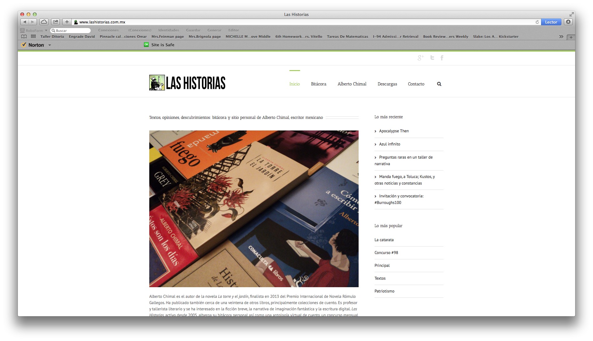 “Las historias” no es la bitácora de un escritor sin más. Es cierto, alberga la biografía, algunos textos y hasta vídeos del autor. Pero también un concurso de relatos mensual muy recomendable por el carácter práctico de los ejercicios que Chimal propone, una selección de los mejores relatos de otros autores que se pueden encontrar en la red o que el autor mexicano recopila para placer del internauta con el subtítulo de “El cuento del mes”, y una serie de preguntas, ejercicios y fragmentos relacionados con su extensa labor como tallerista y profesor de programas de escritura entre otras curiosidades. Esta última faceta, extremadamente recomendable para todo escritor en ciernes, en la que el potencial autor encontrará ejercicios de escritura muy exigentes que le van a permitir velar sus armas en pos de sus textos futuros. Ojalá hubiera existido una bitácora como la de Chimal cuando yo empezaba. Me hubiera ahorrado mucho tiempo (y dinero).
