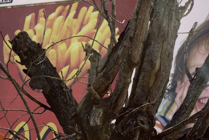 Un árbol quemado aparece en primer plano y al fondo unas patatas doradas de McDonalds se anuncian. Burning Tree. (2009) Las brancas de la mata y los tubérculos en su bolsa roja, hacen un juego formal donde uno deduce que una misma causa -el fuego- ha producido distintos efectos. Esta observación, aparentemente banal, guarda en sí de lo que hoy esconde esta ciudad: sus contrastes visuales..