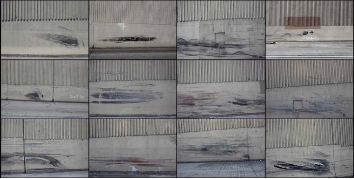 Las metrópolis tienen también sus iconografías gastadas por la sal y el óxido. Iconografías que forman parte de un paisaje que se resiste al olvido. Edificios que tienen la piel de Cy Tombly o Basquiart. Casas hermosamente abandonadas donde la hierba o el grafiti la cubren de una gloria extraña. Y tan importante son estas tumbas abiertas al público, como los rasguños grisáceos del caucho de las ruedas incrustados en la pared en una autovía y que hablan – en silencio- de los accidentes acaecidos. Twelve Traces, (2011)
