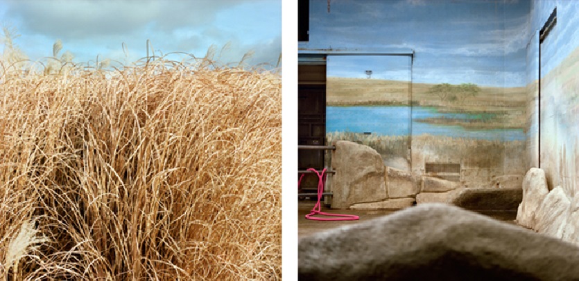 Pero hay también una naturaleza artificial que a Colleen Plumb le atrae. Una naturaleza de Disney World . Una naturaleza sustitutiva que aparenta ser la verdadera para cuando no exista la real. En Rhinoceros House 2002, un espacio donde el animal del zoológico no está, incita a pensar que su entorno natural deliberadamente será una sustitución de lo que pudiera ser: las pampas de cualquier país del continente africano. El cielo junto al agua, vuelven a ser los huéspedes, en este caso, de un paisaje coloreado en la pared y una manguera roja apagada.