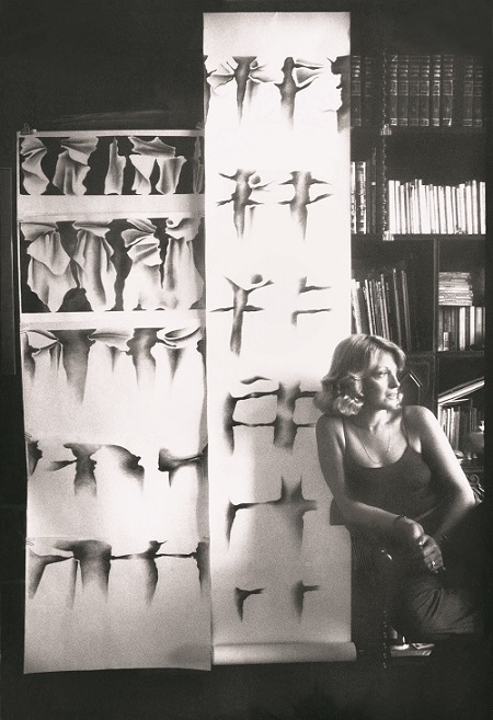 “Cuando me fui a vivir a New York se me ocurrió usar unos rollos. Esto fue en el 87 cuando estaba haciendo las hojas. Quise hacer una muestra gráfica, usé ocho rollos, que yo los llamé “los rollos de mi existencia”, pero con la idea de rollo que tiene que ver con lo que nosotros los argentinos llamamos “rollo” que son los problemas de la vida. Iban del techo al piso, todos sobre la existencia, pero no eran melancólicos, sino lo que cuenta la infancia, las veces que me sentía sola, yo tenía muchas sensaciones difíciles, entonces, trabajé con todo eso. Una obra muy psicoanalítica.”