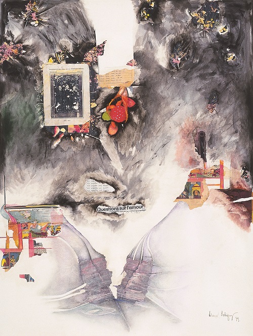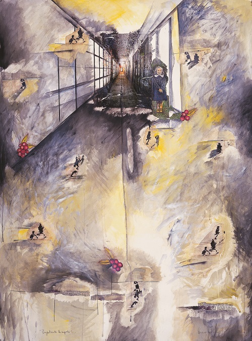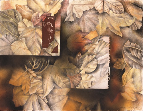 “Tengo una obra que es de mi colección que es una mujer que se va, siempre yo me estoy yendo de un lugar a otro. Es de la serie de las hojas y es la única pieza de esta serie que tiene una técnica mixta, pues la mujer es una foto, todas las demás son pinturas.”