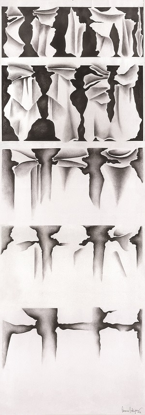 Me sigue explicando de sus períodos, que por lo general duran más o menos unos ocho años. Cronológicamente, estas series comienzan con Las Escrituras, que son obras totalmente abstractas, como nervaduras, como sombras, donde utiliza obscuridades, claridades y vacíos, con esto, ella nos está contando algo. Estas formas se van disponiendo como si fueran renglones.