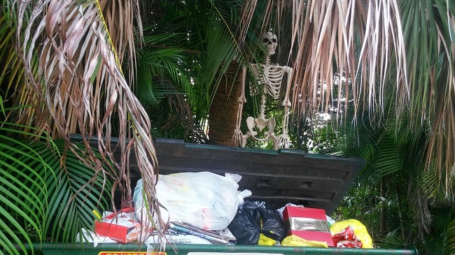 El ruido de pecados que emite en este momento Yunisleidys y Ricardo, nada tiene que ver con su último coito de felicitación por la subida de Trump a la Casablanca de hace un mes. Antes de partir de regreso  hacia la Pequeña Habana -… vinieron en busca de prosperidad- han sacado varios enseres junto al contenedor: un candelabro sin bombillas, dos butacas  agujereadas, un camisón nuevo de lycra  con un mensaje en ruso я люблю тебя ( …sí yo tampoco lo entiendo) y un esqueleto a tamaño natural que dejaron colgado en el roble detrás de la basura. Yo que entendí siempre la necesidad de ella por superar su curso de Asistente de Hospital en Miamid Dade, publiqué en Facebook aquella foto con la calavera ahorcada para que la gente opinase en las redes sociales.