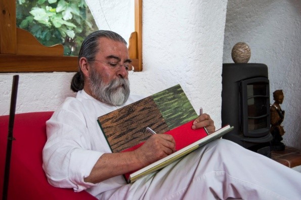 Lo tiene cuidadosamente guardado y a la mano, sabe bien donde está colocado, pero da la impresión a su interlocutor de apenas recordarlo en ese instante, como si llegara a él de manera repentina una idea ya conocida. No es que desvalore sus demás libros el maestro, porque claro están presentes, pero Ojo de Jaguar sin duda es de enorme importancia en su ser. También es difícil imaginar que no estuviese apegado a él o que no supiera donde está colocada cada edición de sus libros en su propia casa. Pero si me dio la impresión de tener bastantes ganas de enseñarme tal o cual cosa, algo que no desdeño y que desde luego agradezco. Yo que solo soy un lector no puedo dejar de elogiarlo, de maravillarme con el cautivador Ojo de Jaguar. Aunque también creo que Efraín correspondió a enseñarme varias ediciones de Ojo de Jaguar porque yo le mostré que llegaba con él, quizá si me hubiese presentado con otro de sus libros esta redacción sería distinta. Aunque no es muy sencillo dar con otro de sus libros. Platicando con él uno se puede dar cuenta que Efraín es un ser satisfecho con su vida y que tiene un fuerte sentimiento por la Ciudad de Granada en España.