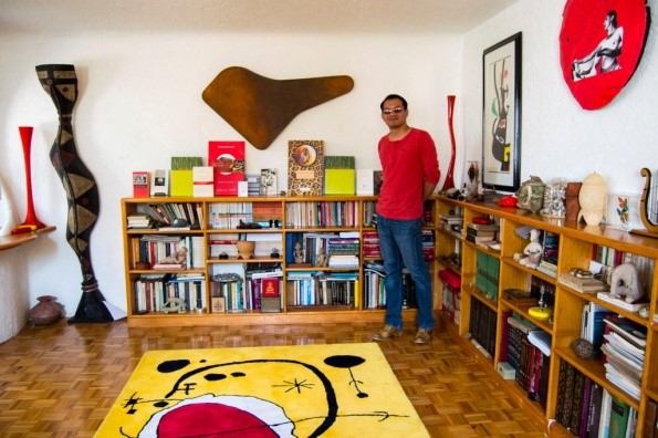 Una vez llegado el momento de presentarnos me dirigí a él con un tono de voz un tanto formal y apresurado, quizá esto se debió a que yo no esperaba pasar más de cuarenta minutos en su casa, no creía que mi presencia valiera más tiempo de su parte. Pero un pequeño ademan de su cuerpo me permitió ver que Efraín tenía la intención de entablar una plática elocuente y casual, un dialogo amistoso para conocernos, algo más que una simple entrevista como yo lo había pensado. Lo primero que hizo el maestro después de estrecharnos las manos a claro interés de Tere y mío fue mostrarnos varias ediciones hermosas y lujosas de Ojo de Jaguar, unos formatos grandes de agradable encuadernación. Una serie de ediciones que tiene colocadas a un costado del pasillo donde están sus cuadros de Toledo y los cuadros de su hijo Balan. La siguiente locación en donde en realidad comenzó la plática fue en un estudio en la parte superior de su casa, ahí note en él cierta inquietud que no puedo pasar por alto; es la ansiedad, no una ansiedad tosca y desesperada, ni desagradable, sino más bien una ansiedad por el gran peso de Ojo De Jaguar, una ansiedad que me pareció natural, inconsciente, viva, alegre y juguetona. Un yo soy, un yo soy el autor, no de forma pedante, sino más bien para reforzar en él la certeza de haber escrito ese libro. Y es que Ojo De Jaguar se encuentra por todos lados a donde uno pueda acercarse en su casa, o al menos yo puedo afirmar esto de los lugares que tan amable me mostró.