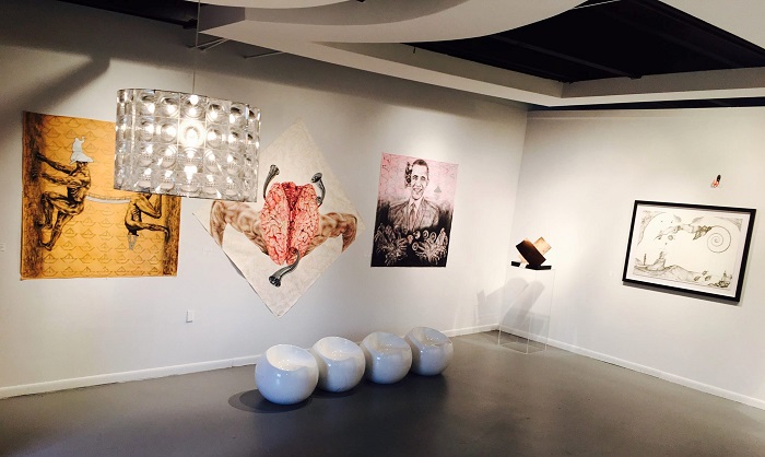 También se evocan desde la potencia visual y la denuncia política dos piezas de Yourden Ricardo que muestran un resumen de lo vivido hoy en su interior como artista. Es decir, saca a la luz las preocupaciones escondidas sobre dos temas en Juggling of power y aparece la imagen sonriente de Obama rodeado de bocinas al aire mientras sus manos adquieren la forma de un movimiento imparable en un circo. Imagen que curiosamente – aunque en mi parecer ya queda implícita en el concepto de la obra- aparece en forma de ícono en el lado derecho de la tela. Cuban Style Pushups en cambio es una obra potente, lujuriosa, cabría y desconcertante que provoca el miedo y la pregunta tal como está concebida. La aparición del cerebro “al aire libre” mientras un sujeto hace flexiones en el suelo es de un simbolismo arrollador lleno de esperanza por lo que pasa en la Isla y, al mismo tiempo, descarnada por el plano que ocupa en la composición visual en el cuadro.