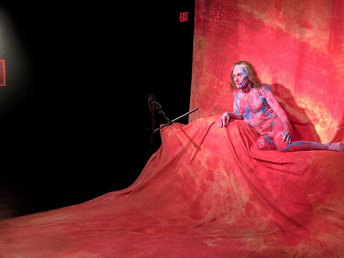 Una figura de mujer totalmente sostenida en sí misma y sobre el manto de una tela jaspeada en rojo…está ante el público y rodeada por su misma imagen varias veces repetida a través de sus distintas pinturas. Solo un ligero pestañeo, cada vez que la retina lo pide, tiene vida con respecto al movimiento. Su cuerpo inmóvil está untado de rosas y azul. Desnudo. Brillante. Solitario. Abierto…Impertérrito, tiene frente a sí un micrófono.