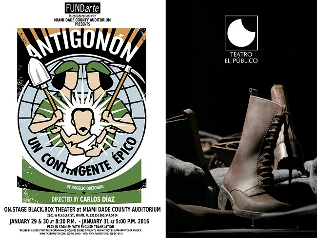 Autor original Sófocles. Versión adaptada Antigonón. Un contingente épico Rogelio Orizondo / Carlos Díaz. Dirección Carlos Díaz. Elenco Giselda Calero, Daysi Forcade, Luís Manuel Álvarez, Roberto Espinosa, Linnet Hernández. Coreografía y Movimiento Xendra Cruz/Sandra Ramy. Vestuario. Celia Ledon/Robertiko Ramos. Diseño de Luces. Óscar Bastanzuri. Música Bárbara LLanes. Producción . Teatro el Público y FUNDarte, MDC Auditorium . Compañía. Teatro El Público.