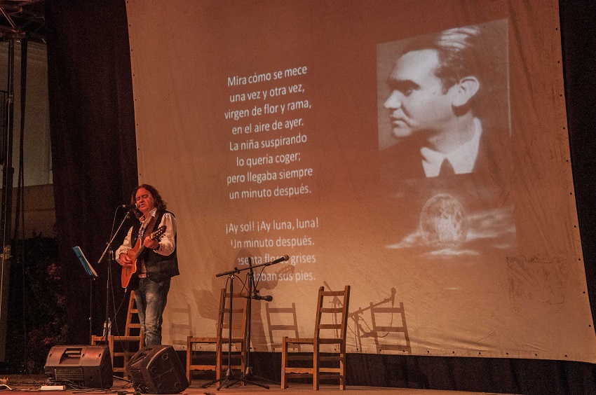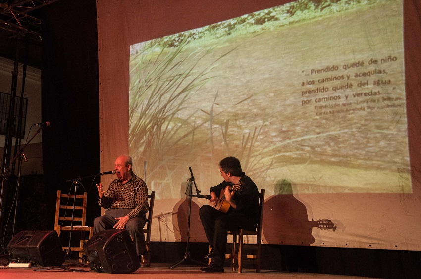 Después de este comienzo la voz de la maestra nos mece anunciándonos la presencia del maestro de hombres y mujeres, y también del flamenco, el profesor D. Alfredo Arrebola acompañado a la guitarra por el notorio guitarrista D. Rafael Soler. El aire se llenó de cante, de acordes profundos en la evocación de lo jondo que nos mueve. El aire se llenó de duende por ‘livianas’, ‘Malagueñas’, ‘Tonás’, ‘Rondeñas’, ‘Peteneras’ y ‘Cantes de siega’; una lección del maestro que cantó textos de los poemarios ‘Los lazos de la pasión y la sangre’ e ‘Hilvanes del agua’ de F. Beltrán