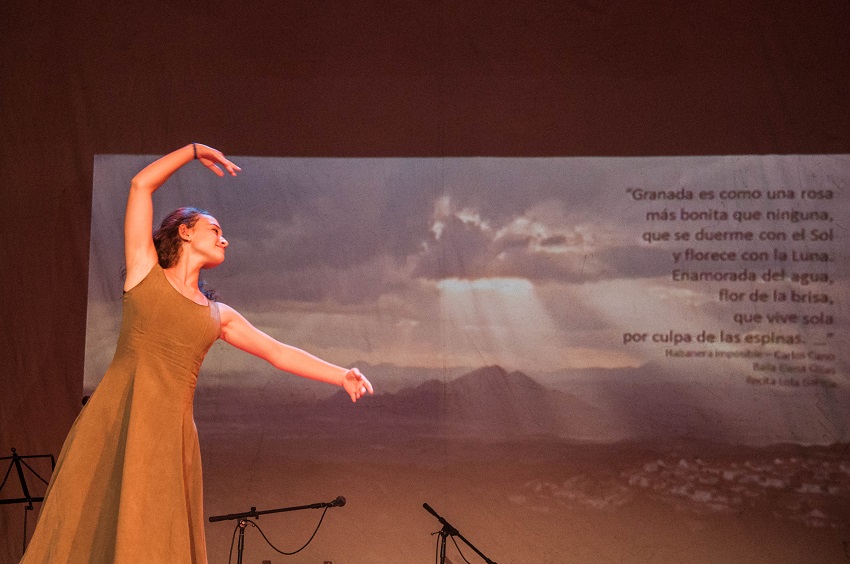 Un arranque de emoción profunda, de nostalgia que rodaba en las lágrimas furtivas, se apoderó del lugar al anunciar el homenaje a Carlos Cano por la joven bailarina Elena Olías García, con motivo de los setenta años de Carlos que estos días corren por los vientos de Granada y el mundo. En el silencio profundo sonó primero la voz de Lola García que recitaba versos de la ‘Habanera imposible’ en sus primeros acordes, después la voz de Carlos resonó como un estallido de fuego sin artificio y los pasos elegantes y precisos en la danza de Elena le dieron dimensión al profundo sentimiento.
