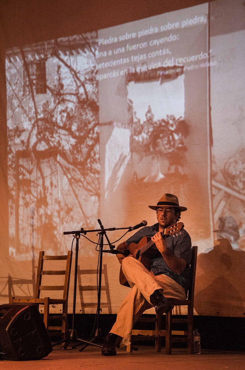 Tras tragar saliva la maestra anuncia, oportuna como sutura de herida, la voz y la música del cantautor universal Paco Damas. Un médico del alma que nos trajo en letra de Federico un ‘Árbol de canción’ donde setenta flores grises se enredaban a sus pies. Un hombre de compromiso que clama por el hombre en todo lo que canta, y así, con la determinación y la dignidad que brota de la entraña y la razón más verdaderas, elevó su voz en las canciones ‘Canción para los refugiados’, ‘Que a todas las balas se les haga de noche’ y ‘Paz’ de su disco ‘Que a todas las balas se les haga de noche’ –un disco patrocinado por la Fundación ‘Cultura de Paz’ de la UNESCO, entre otras organizaciones e instituciones-. Esta última canción cerró el acto con un minuto de silencio y cantada en los coros por todos los intervinientes y el público.
