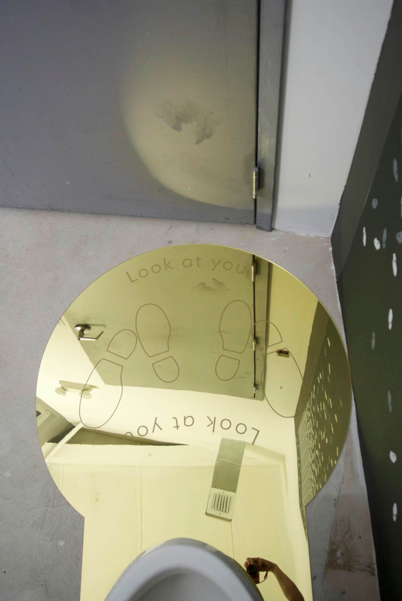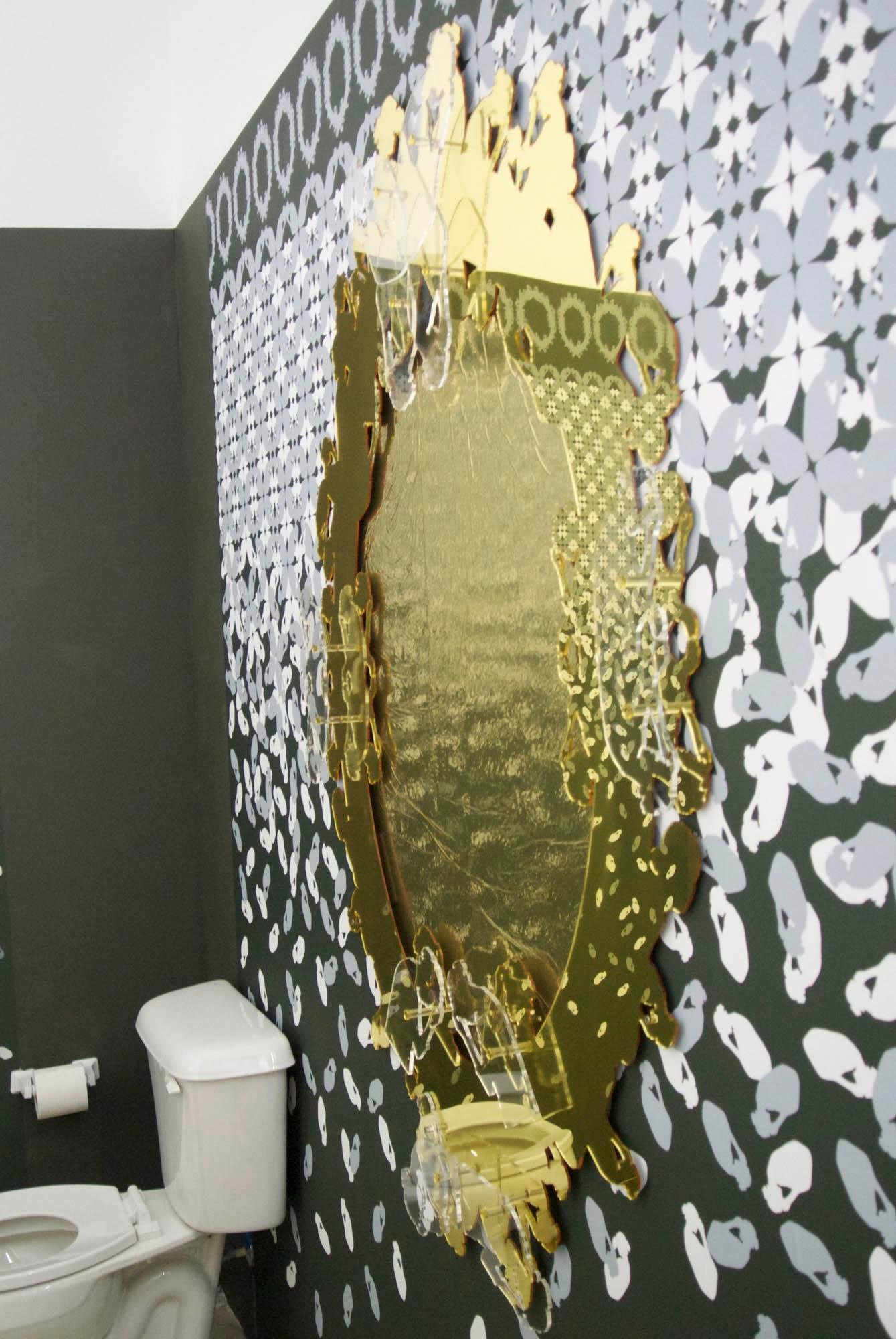Basado en un verso de Octavio Paz, Leslie Gabaldón mostró al público el pasado 20 de enero una propuesta inquisidora y sustantiva sobre el tinte de azogue que permite reflejar nuestro rostro: el espejo. Y lo hizo interviniendo no solo este objeto sino sus contiguos. Desde el estampado de la pared imitando a la tramas de un sinfín de baldosas descomponiéndose a medida que llegan al suelo, las posibles huellas tuyas inherentes en “oro” cuando en posición meditabunda defecas en la taza, hasta la balanza donde en vez de indicarnos nuestro peso, nos muestra versos del autor.