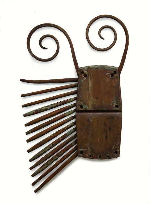 Hay un corpus de insecto asimétrico que me cautiva. Unas pinzas de humor , en su supuesto rostro, dan un toque infantil y a la vez anciano a este bicho. Una pieza que se impone principalmente por su sencillez, y su particular textura al acercarse. Consigue, en su fondo blanco de la pared en la galería, una extraña sensación cuando traduces el mate de la madera con un muy ligero toque aceitoso en un objeto de culto. Y dan unas inmensas ganas de acariciarla (lo hice…sorry). El origen orgánico de esta hermosa composición en madera natural y su silenciosa armadura como metáfora, es la belleza de esta pieza. Bajo el mismo concepto, hay otra obra mucho más explícita y simétrica, en este caso, de similitud a un cangrejo en la exposición que dan un tono elegante y limpio al discurso.