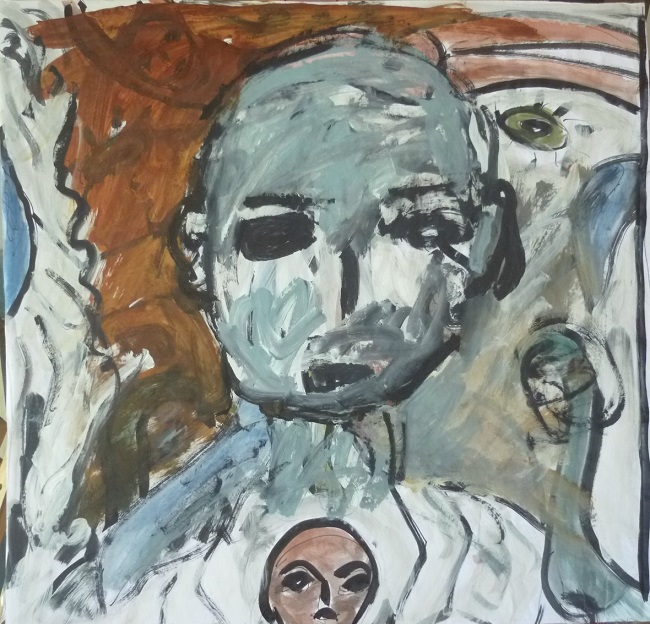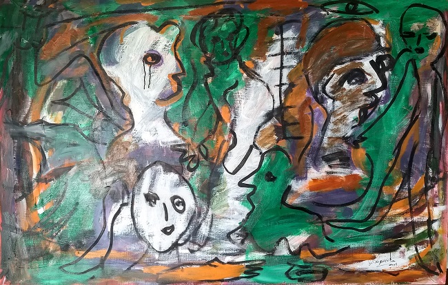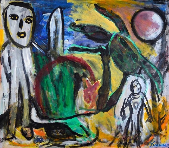 En algunos óleos conforma más un paisaje humano relacionado con lo que se encuentra. Deformaciones figurativas que hablan de la angustia y, en otras ocasiones, de la felicidad que evoca el simple hecho de existir o estar dentro del medio que te encuentras. A veces rodeado por la luna, un amigo o un insecto volador. Colores fuertes y chillones…sucios en su composición. Telas que hablan de un todo comprimido y sintético en un mismo plano. Una manera de abordar la sorpresa o la noticia como en Carnavalesco, la pieza inferior.