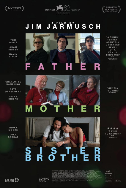 Dirección. Jim Jarmusch. Año 2025. Duración 110 minutos. Guión y Música Jim Jarmusch. Actores y actrices. Tom Waits. Adam Driver. Charlotte Rampling. Cate Blanchet. Mayim Bialik, Vicky Krieps, Indya Moore, Luka Sabbat…Sinopsis Película dividida en tres actos alrededor del mismo hecho: el reencuentro de miembros de una familia. Unos hermanos ya adultos se vuelven a juntar después de años sin verse, forzados a enfrentarse a tensiones no resueltas y a reevaluar sus tensas relaciones con unos padres emocionalmente distantes. Cada una de las tres historias tiene lugar en un país diferente: “Father” está ambientada en EE. UU., “Mother” en Dublín, y “Sister Brother” en París. (FILMAFFINITY)