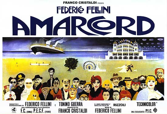 Después soy yo quien me enamoro de lo barroco, lo plural o lo indecente de un hombre con secuencias de la tradición más picaresca española, como las que se evocan en Amarcord. Cuando uno de sus protagonistas adolescentes – su alter ego-  en busca de tabaco gratis, se encuentra a la estanquera en su establecimiento, ofreciéndole sus voluminosos senos a cambio de un cigarrillo. Una escena que, el cantante Joaquín Sabina evocara, en la letra de una de sus canciones que en este momento no me viene a la memoria su título. El Fellini de Amarcord es el encuentro con la memoria de la infancia en su ciudad natal, Rímini:  la escuela y sus esperpénticos profesores, el mar (uno de los elementos clave en su obra), el sarcástico narrador con personajes como Mussolini, con su padre, con su pandilla, con la loca del pueblo (La Volpina), la guapa (La Gadisca)  o el loco de su tío ( …que no quiere bajar de un árbol hasta que le traen una mujer; en este caso una monja) con el galán…El Fellini lírico. El que nunca olvida a su amigo el compositor Nino Rota para amenizar sus obras visuales, como en E la nave va.