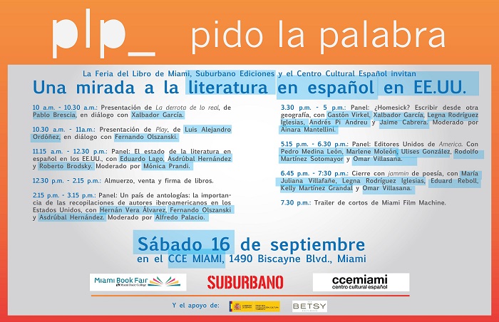 La Feria del Libro de Miami, del Miami Dade College, Suburbano Ediciones y el Centro Cultural Español, invitan al festival “Pido la palabra. Una mirada a la literatura en español en los EE.UU.” que reunirá a varios de los narradores, poetas y editores más representativos de esa literatura en los Estados Unidos de América.