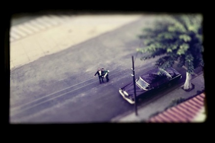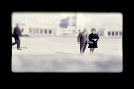 ¿Por qué historia?. “Historia es lo que acordamos entre todos que ha pasado pero la memoria es una cosa orgánica” dice Lorena en su texto de presentación de la galería. Particularmente desconozco su relato y puedo deducir por los hechos visuales que observo dos cosas: una historia familiar y la historia de un país en una época. Descubrí el último por intuición: Argentina. Y mi fantasía me trasladó a los 70. Al azul algo canoso del tipo de película fotográfica – en mi país lo llamábamos color agfa para distinguirlo del kodak- y a los sujetos del relato familiar con sus trajes y automóviles americanos, y los incipientes rascacielos de algún lugar de veraneo del país. La historia familiar escogida es la personal e intransferible. Y quiero destacar en ello una que llegó a mis adentros (Untitled,3) Una foto de la calle tirada desde un cuarto o quinto piso donde sólo se ven una pareja mirando hacia arriba despidiéndose y un auto negro junto a un arbol. Un adiós tan natural que resume todo el episodio de complicidad de un clan compuesto por padres e hijos.