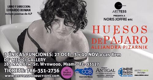 Hoy, en un pequeño espacio dedicado al arte en Wynwood, la galería De’ Medeci, lo vuelve a hacer en la intimidad con lo mejor que sabe construir como escritor teatral: el drama interiorizado para los que, el deseo, simboliza el Todo. En este caso; el de una poeta nacida en su lugar de origen, Buenos Aires. Una poeta “maldita” tal como lo fueron Baudelaire, Paul Verlaine, Arthur Rimbaud, John Keats, Charles Bukowski o el propio Jim Morrison: Alejandra Pizarnik. Voz y eco de unos versos sin límites; entre una existencia sin límites y una obra sin límites.