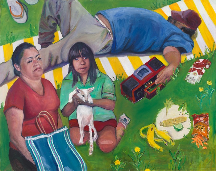 The artist hails from Mexico and her experience of that country’s rich heritage added its brilliant saturated colors to the subject matter, creating a festive sensibility.  She told me her goal was not to create a political statement of marginalization in the pieces but rather, to use universal themes where she could apply her culture’s visual language, employing Mexican folkloric elements in bright colors, objects and patterns with the subjects’ expressive faces simultaneously referring to the “naïf.”