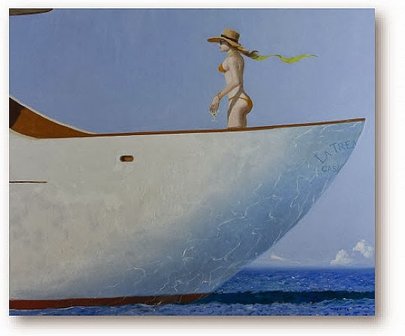 Lo mismo con Cosette a bordo de la Tremebunda (2013) que no cuaja. Cosette, la modelo de bikini color naranja con nalgas siliconadas portando sombrero de panama, camina, martini en mano, en dirección a popa como si harta de la vida. La protagonista no es Cosette, sino la proa aquilina y desabrida del Tremebunda. Si he escrito un párrafo sobre la pintura es porque (paradójicamente) no hay mucho que decir. Toda pintura no tiene que ser una obra mayor, se sabe. Tampoco menor. Ni cada esfuerzo debe merecer un párrafo.