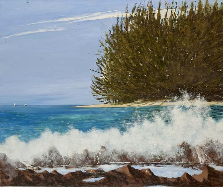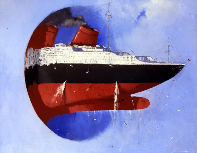Sería injusto no mencionar la pintura “Coming Home” (arriba en este post). Es un cuadro sugestivo en su perspectiva geométrica, así como el efecto dramático del yate blanco que se penetra la oscura oquedad del gigantesco promontorio. Penetrar una boca negra es siempre una aventura.