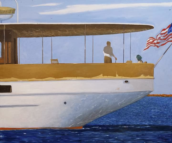 Sunday on the Nagarransett, por ejemplo: La proa intrusiva del yate anclado cerca de la costa, en el mar añil con esas dos siluetas sumergidas en lasitud geriátrica. ¿Se pinta un cuadro solo por elaborar el reflejo plateado del mar en el bajo techo o en la superficie de la proa de fibrocemento de un yate? Será que no apreciamos la sutileza del comentario social. ¿Pero cuál comentario? En el arte no hay necesidad de forzar lo que no está a la vista en el cuadro. Digamos francamente que la proa con las siluetas se lleva casi todo el cuadro, que la bandera americana que ondea al borde de la costa de Narragansett podría muy bien ser la bandera de Italia en un paisaje costero de Amalfi en un postcard para turismo. Distinguimos las siluetas de una pareja adinerada, solos, aburridos. ¿Y qué? No cabe ni siquiera una doble lectura. Brilla por su ausencia la mordida de Larraz.