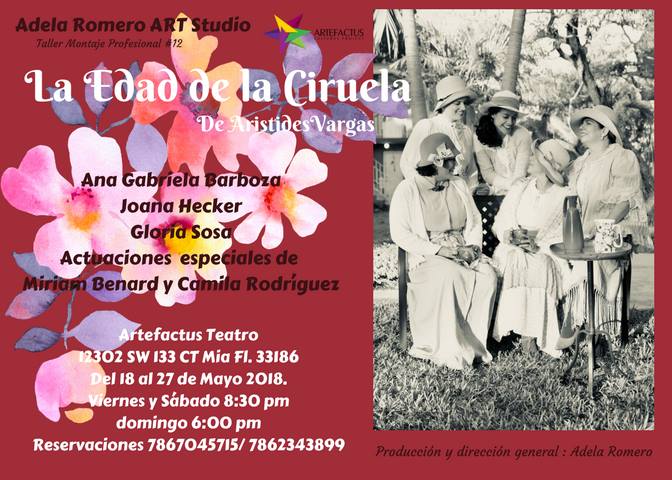 La respuesta a la pregunta del encabezado de esta crítica teatral… “¿Qué edad debe tener la ciruela para ser vino y no vinagre?”… la pueden encontrar en Artefactus Teatro 12302 SW 133 CT. Miami, Fl 33186 No se la pueden perder!!! … cuatro últimas funciones de “La Edad de la Ciruela” los fines de semana de junio 8 y 15 (8:30 pm viernes y sábado) y domingo, 6 de la tarde. Reservaciones: Eddy 786 704 5715 Adela 786 234 3899 Boletos: $20.
