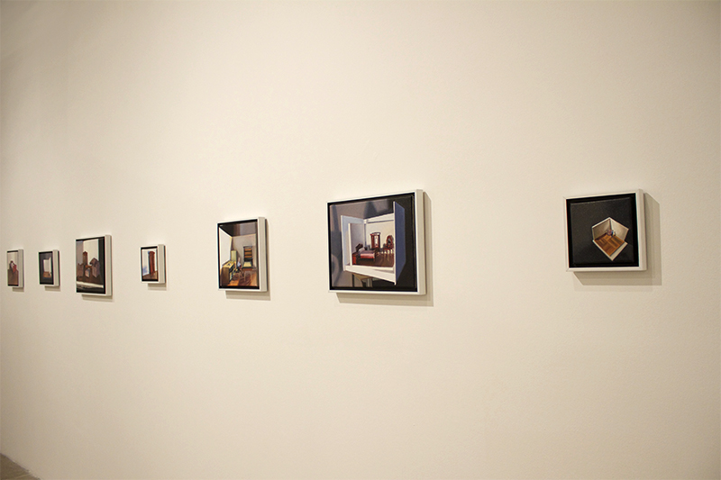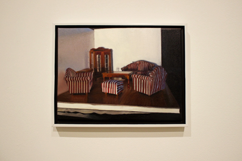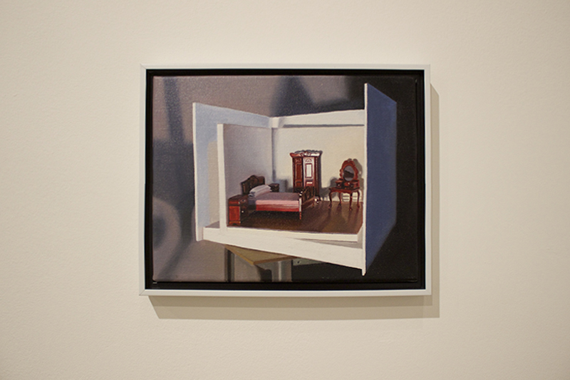 Y ahora la segunda pregunta ¿por qué esta retahíla filosófica para hablar de unos muebles en miniatura, la mayoría de ellos sin sujetos humanos en el espacio, ubicados en un hogar sin nombre ni tiempo, y con el detalle de la maqueta como protagonista de la realidad y no como un lugar de apoyo a una narrativa?. Nada más existencial, inquieto y provocador que representar un espacio bajo el silencio del “no pasa nada… pero las cosas están ahí”. Y a la vez, nada más aterrador que inventar una realidad de juguete donde el vacío corta el aire solo al observarla en estos lienzos.