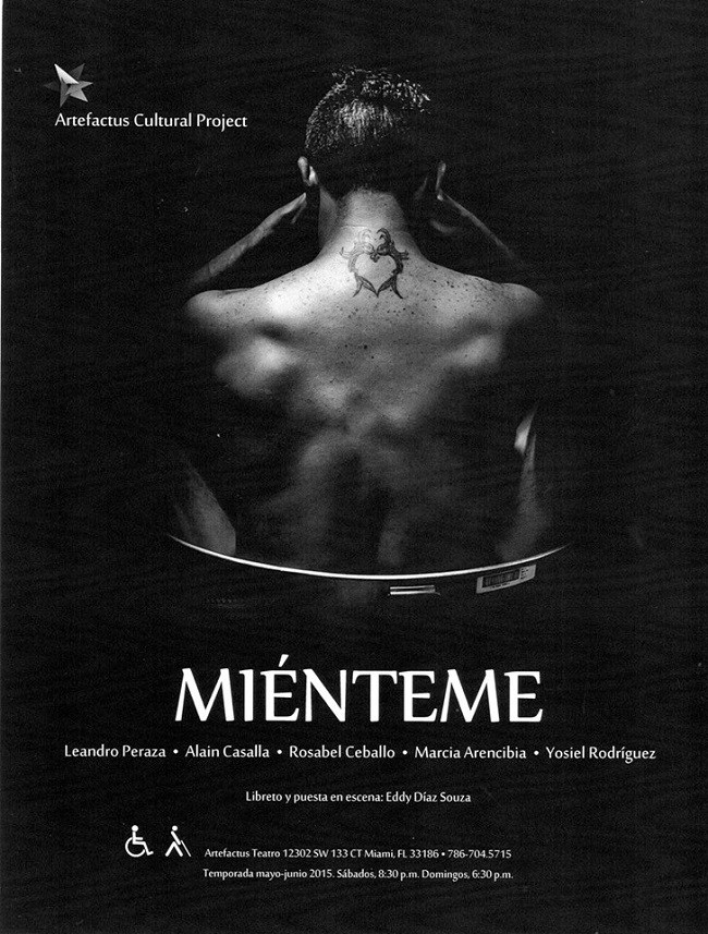 Eddy Souza, si bien sólo se centra en la antropología social que acontece en su comunidad y que domina al dedillo, hace un retrato en Miénteme distinto y lleno de matices dentro de lo que podría ser una interpretación del teatro costumbrista cubano, tan en boga hoy día en Miami. Su diferencia…. es la manera en cómo dirige y concibe su puesta en escena de estos “boleros” y la plástica que le inyecta a su escenografía, la sutil y acertada banda sonora (Nelson Jiménez), la elección del vestuario y una acurada iluminación que ya empiezan a ser una marca propia y un signo de calidad de Artefactus Cultural Project. ER