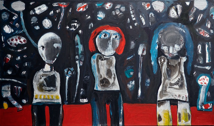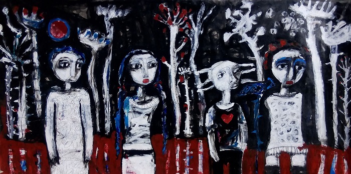 Del mismo modo, los personajes de la obra anterior avanzan unidos por un bosque, donde a pesar de la abundancia del negro persiste la luz y el rojo. A pesar de que los individuos no se comunican, la sensación que transmiten es de sosiego y seguridad.
