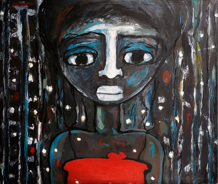 Partiendo de esa categorización básica que hemos ofrecido de la obra de Iris Pérez, podríamos comenzar analizando la obra Partículas Elementales II. En ella se nos ofrece un paisaje urbano nocturno, donde predominan los colores fríos y la ausencia de perspectiva. La paleta es la propia de Iris: colores primarios (azul, rojo y amarillo) junto con el blanco y el negro, que eliminan por completo el preciosismo y lo accesorio y permiten una composición equilibrada. La ciudad y la noche caen sobre el espectador y los tres personajes principales, que aparecen aislados, incomunicados y profundamente solitarios. Los rostros muestran abatimiento y un sufrimiento ya aceptado, pero no por ello menos doloroso. Sin embargo, en un espacio lúgubre que hace referencia a la prostitución infantil (2), aparecen elementos esperanzadores, como los entes que flotan en la noche oscura, las luces y un suelo rojo saturado que ofrece calidez a las figuras.