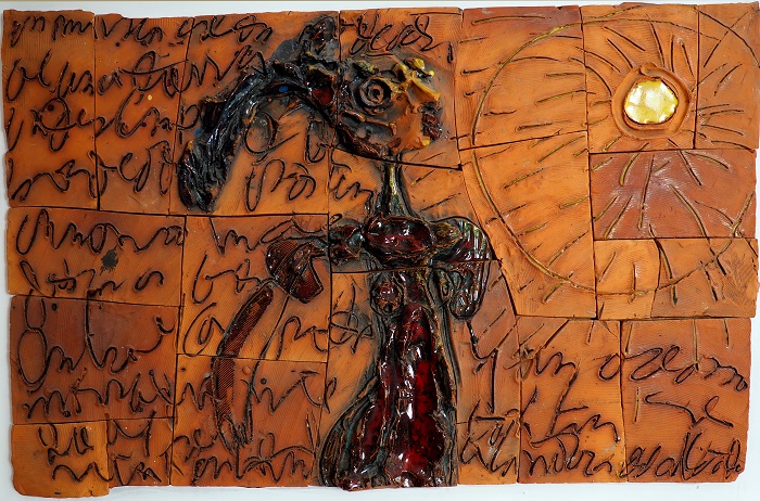 En esta obra, Iris incluye una técnica que incluye la arcilla y el esmalte y utiliza el modelado y la literatura a través de trazos enérgicos y profundos. Los ritmos, tensiones, modulaciones y rimas propias de la escritura son traducidas a la cerámica, que con una expresión propia, trasmite nuevos significantes. Ese nuevo lenguaje, que parte del impulso gestual de Iris, permite una conexión íntima y personal entre diferentes tipos de arte. En mi Isla Estoy nos muestra a un personaje femenino que avanza decidida hacia el Sol. Los colores son terrosos, cálidos y muestran un bienestar que contrasta con el resto de las obras mostradas.