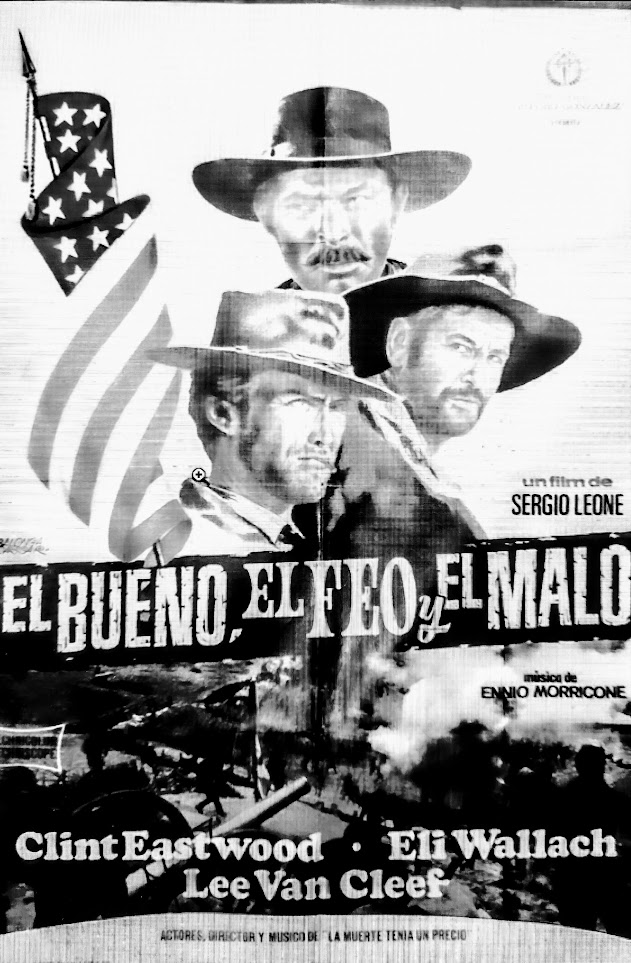 En la entrada del bar del cine, no paran de abrir y cerrar las puertas con los cigarrillos de papel en mano y los envases de cerveza en los dedos de la izquierda. El humo de la sala es un hecho. El mismo que evana ClintEastwood –El bueno– con el pitillo en su boca mientras saca el revólver en un cementerio lleno de cruces y soledad frente a Eli Wallach –El feo- en el famoso Sad Hill que, curisoamente, no fue rodado en Texas, donde se suponte que ocurre la acción, sino que este spaguetti western de Sergio Leone fue rodado en el Valle de Mirandilla en la provincia española de Burgos. Sigamos.Han encendido las luces después de que vemos al malo -Lee Van Cleef- tendido en una tumba vacía mientras el feo, con su horca al cuello y gritando a voz perdida, maldice al protagonista de la película cabalgando lentamente hacia la colina.