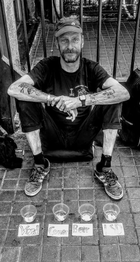 No supe donde iba a depositar mi limosna, y se la di en la mano. Era la primera vez que me sentía culpable por una acción de este tipo. No por el acto en sí, sino por averiguar donde iba a ir mi diminuto dispendio: si hacia el camino de su autodestrucción, o a la vasija para ingerir alimentos.