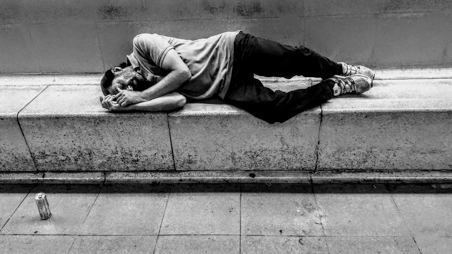 Su cama es de piedra. O lo que es igual; es el banco de descanso de los transeúntes. Él no ha sustraído nada a nadie que yo sepa. Simplemente, la borrachera de Antonio  sigue en plena mañana de San Juan. Su dinero se ha agotado. Tendido, espera que esta lata de bebidas vacía que ven a la izquierda, la derrumbe alguien. Alguien que se harte de su sombra. Una patada que funcione como el timbre de un despertador. Cuando esto ocurra, el siguiente metro para viajar hasta la eternidad más próxima… será un hecho y mudará su cama.