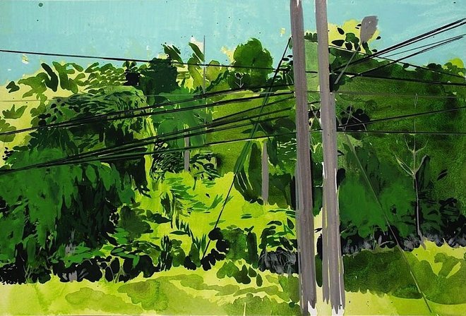 Los paisajes de Hurvin Anderson, sin serlo, adquieren la visión de ser frontales. Mezcla la abstracción en zonas donde es evidente que la realidad es palpable. Y en zonas donde podríamos creer que no es necesaria la abstracción, aparece una pintura realista de colorido y empaste matissiano en sus paisajes. Todo y que es londinense, en su formación hay una mirada caribeña por la intensidad de la luz y la humedad que transpiran muchas de sus telas donde el verde vegetal inunda el espacio .