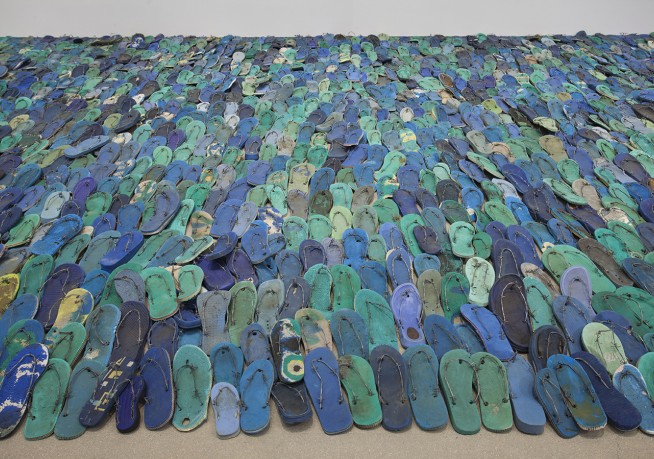 Tony Capellán, nacido en R. Dominicana presenta dos mares. Dos aguas con dos metáforas distintas. Mares invadido 2015 y Mar Caribe 1996. En el primero los deshechos de plástico y basura en el agua, son parte de la obra; los azula y los blanquea hasta formar una hermosa-suciedad con tonalidades cromáticas. Nunca mejor dicho: una belleza convulsa por el impacto que provocan los deshechos y el color. En cambio, en el segundo, la obra se torna trágica e inolvidable: miles de zapatillas de chancleta azuladas están bajo un empeine de alambre de púas. La imagen es poderosa y nos recuerda el dolor innegable de los que habitan y sufren la pobreza en este planeta.