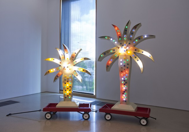 Yto Barrada es una mujer marroquí, si bien ha residido en Nueva York y está muy ligada al campo cinematográfico. Sus piezas son en parte cinéticas como en algunos de sus videos, o estáticas como la divertida Twin Palm Island 2011. Posiblemente un homenaje a su cultura de arena, mar y recuerdos lumínicos de su ciudad natal Tánger donde Paul Bowles desarrolló su mejor obra literaria.