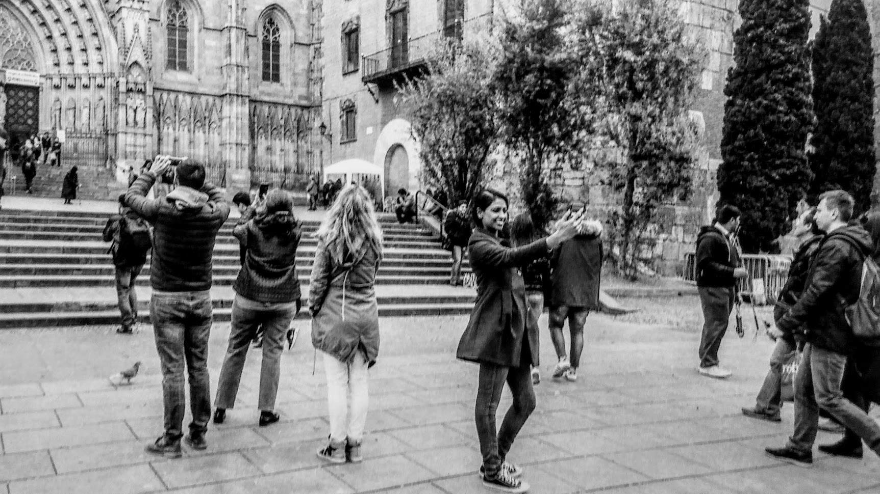 Como elementos de escenografía: El patín. El patinete. El sol radiante de la una. El teléfono móvil como espejo. Las sombras en la pared de cualquier edificio blanco. La bicicleta aparcada en un árbol.. El vidrio delantero roto de un auto. El mercado y su ritual de mercaderes y curiosos. El maleante. El pedigüeño bajo la súplica… Los plátanos de la ciudad frente a sus sombras. Sus grafitis…La catedral, junto el acoso turístico y la sonrisa de una mujer retratándose desde un smartphone.