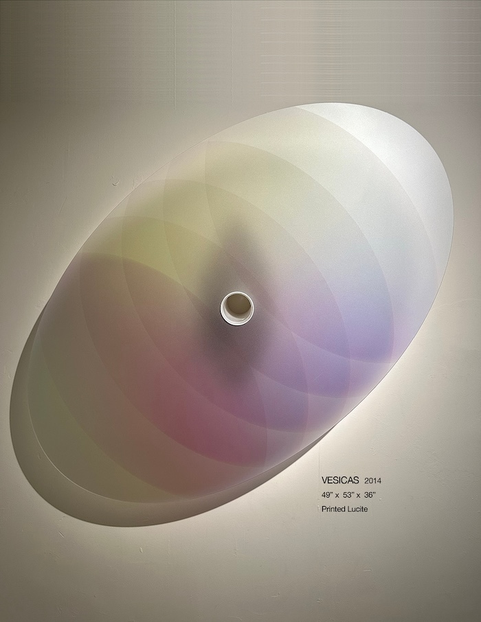 En algunas de las piezas, también podemos observar los colores vibrantes que utiliza el artista, aportando a las mismas una profundidad que evoca paisajes de nubes a la deriva y/o olas de agua, insinuando también ciertas revoluciones que desgarran la tranquilidad atmosférica al aparecer como elementos gráciles y adversos al resto de las obras aquí vistas, ofreciendo al espectador otro ejemplo de esculturas geométricas.