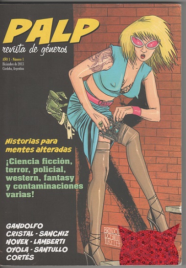 Con notable repercusión en los medios y entre los lectores, hace poco apareció la revista argentina PALP, Revista de Géneros (ver: revistapalp.wordpress.com), que viene a llenar un hueco antes evidente en la oferta editorial. Su nombre es un juego fonético con la pronunciación de la palabra inglesa pulp, que designa popularmente a publicaciones características de la primera mitad del siglo pasado, de encuadernación rústica y consumo masivo, especializadas en narraciones fantásticas, de ciencia ficción, policiales, terroríficas, etc. El término popular pulp fiction hace referencia al tipo de papel empleado para imprimir este tipo de revistas económicas, fabricado con desechos de pulpa de madera, amarillento y barato. La PALP argentina es en sí misma un homenaje a esas revistas donde hicieron -en muchos casos- sus primeras armas y consolidaron su prestigio masivo autores de la talla de Jack London, Agatha Christie y Arthur Conan Doyle, Herbert George Wells, Dashiell Hammett, Samuel Langhorne Clemens (cuyo famoso seudónimo fue Mark Twain), Howard Phillips Lovecraft, Isaac Asimov, Robert E. Howard (el autor de Conan el Bárbaro), Raymond Chandler, Edgar Rice Burroughs (creador de Tarzán), además de Charles Bukowski, Tennessee Williams y Ray Bradbury, entre otros. Conservando el espíritu de sus célebres antecesoras, como Weird Tales, Amazing Stories, Black Mask, Horror Stories o The Shadow, sin embargo PALP opta por una presentación gráfica mucho más cuidada que la de sus ancestros: es una revista-libro de 160 páginas con buen papel de interior y cubierta a todo color, con encuadernación cosida, a lo que se suma el alto nivel de sus ilustraciones, firmadas en cubierta e interior por Nicolás Brondo, artista plástico de amplia y reconocida trayectoria que también aporta su talento a publicaciones como la italiana Bone Machine y la novela gráfica Reality Crash. Anunciada como de aparición semestral, su editor responsable es el poeta y guionista Diego Cortés, quien también integra el Consejo Editor junto con otros reconocidos escritores locales: Sebastián Pons, Martín Cristal y Guillermo Bawden.