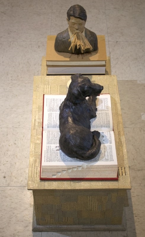 Bajo el volumen escultórico, provocadoramente silencioso, nítido y “monótono” -…y lo digo desde un punto de vista positivo este último término- una preocupación que lo inviste hacia una manera propia de detenerse a narrar lo que le interesa: el saber qué hacemos aquí. Solo a él le he visto empapelar un mueble o distintos objetos en hojas de periódico -geométrica y delicadamente recortado- para enfatizar o recrear lo que es el teatro de la vida en cada lectura de sus piezas. Y hacerlo como telón de fondo para advertirnos que, en verdad, somos información… se lea cómo se lea. Sólo a él lo he visto utilizar los significantes para un interrogatorio sobre lo existencial bajo una imaginería cercana al cómic o la fotonovela. Solo él me hace reír y me asusta, al unísono.