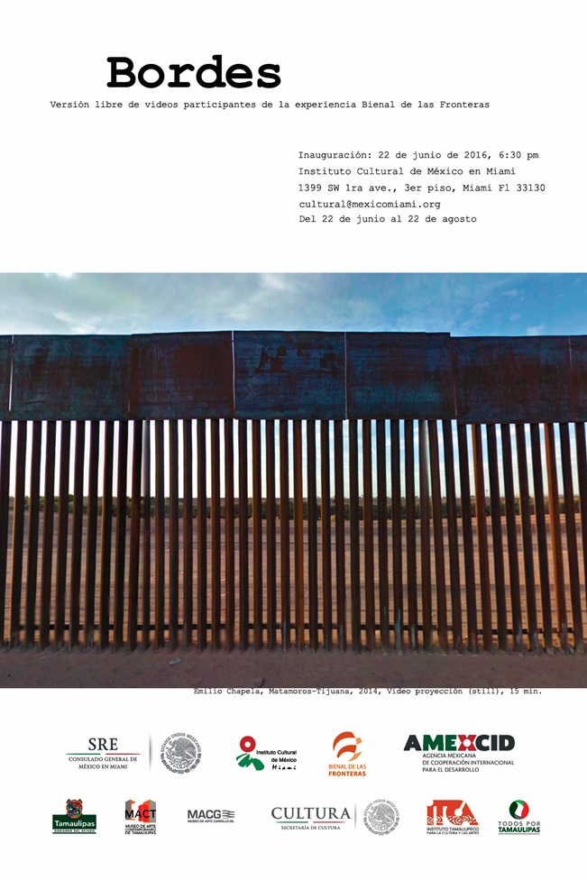 El 22 de junio el Instituto Cultural de México en Miami (ICM) abrirá la muestra de videoarte “Bordes”, una selección de videos participantes en la Bienal de las Fronteras. Esta exhibición permanecerá abierta al público hasta el 22 de agosto del 2016.