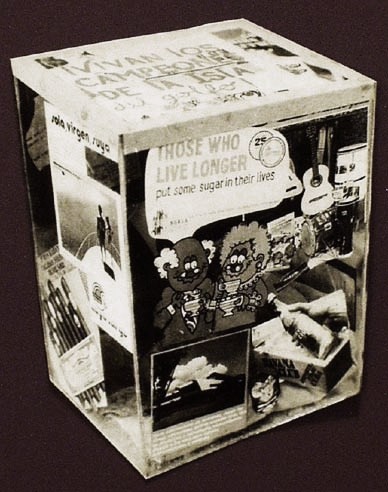 Finalmente, mi obra se titulaba Vivan los campeones de la isla del golfo, collage y objetos (30 x 10 x 20 cm) en una caja de plexiglass con forma de urna electoral, cubierta de publicidad turística pegada de adentro hacia fuera, por cuyos intersticios se podían ver en su interior una camisa y guantes de trabajo sucios de tierra, bonos y diplomas laborales, etc. El título parodiaba una de las promociones turísticas que decía algo así como “los campeones del golfo pueden venir en sus propios yates” y estaba manuscrito en letra cursiva sobre el lado superior. A la inauguración asistió Marcia Leiseca, presidenta del Consejo Nacional de las Artes Plásticas, y también la recorrió conmigo, pero con una actitud mucho más empática y respetuosa.