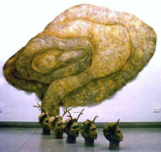 El día antes del festival se recepcionaron y montaron todas las piezas. Cada artista traía lo suyo y lo íbamos colgando en el espacio en que mejor funcionaba, aunque terminamos llenando los huecos por el poco tiempo disponible para reubicar obras. Recuerdo algunas piezas como la controversial Reviva la revolu… de Aldito Menéndez, un lienzo de gran formato con fondo oscuro y un texto rotulado en blanco con brocha gorda. Iba sobre el piso y recostada a la pared y delante en el suelo una vieja cazuela contenía un papel que pedía donaciones para poder terminar la obra. Abdel no recuerdo si expuso, pero llevó con mucho afecto una fina pieza conceptual de Carlos Michel Fuentes –por esos días enfermo y hospitalizado– que reproducía estilo póster la famosa foto del Che muerto (entonces tabú en los medios oficiales) y un texto que ofrecía una definición clínica del asma. Angel Ricardo Ríos presentó una bandera cubana hecha de cartones de huevo empatados y pintados con tempera o acrílico. Lo de Hubert Moreno era otra imagen del Che, pero dibujada con grafito en impecable estilo académico y un texto en letra de molde “Justo a tu gusto”, que era el lema de algún programa de radio. Maite Díaz González presentó una hermosa instalación titulada Viaje al encuentro de Coatlicue (ver foto), 300 cm x 250 cm de altura, acrílico, tela, yeso, arena de la playa Santa Fe y tintas, técnica mixta. Era “un homenaje a la energía femenina creadora, a la naturaleza, a ese poder femenino de dar la vida y de transformar la materia, la tela es una especie de matriz, como un útero pero es a la vez un cerebro… el espacio de los sueños, de las ideas, de lo posible. Es un homenaje a Frida Kahlo. México para mí en aquellos momentos era una fuente de inspiración, sus culturas precolombinas, sus mitos poéticos y surrealistas de trasformación, la expresión de la dualidad y sus derivaciones simbólicas, la noche y el día, lo femenino y lo masculino, lo duro y lo blando…”