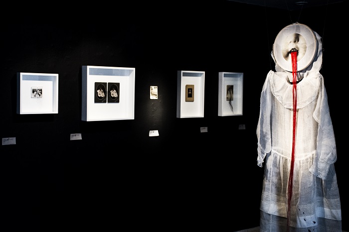 My idea with them was to assemble small floating bodies. I transformed the clothes with sinister embroidery and also I put bugs. Because of this, the bodies of the children give the impression that they are being invaded by vermin. Many times the audience enters the exhibition and they do not notice the main body, which is levitating. When they see this body they are frightened.