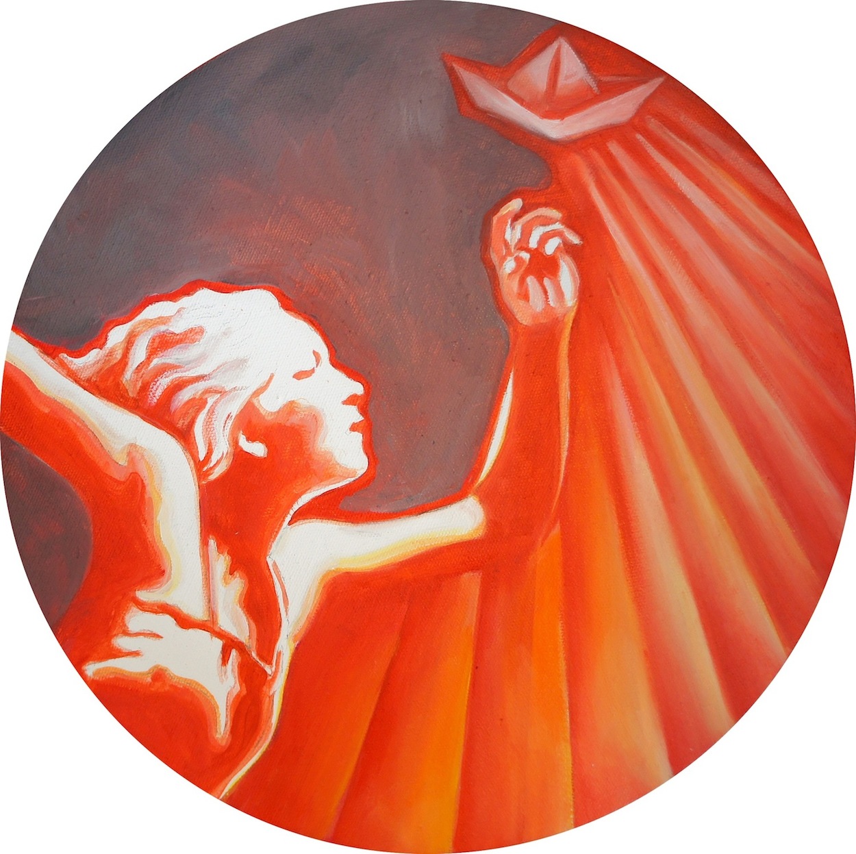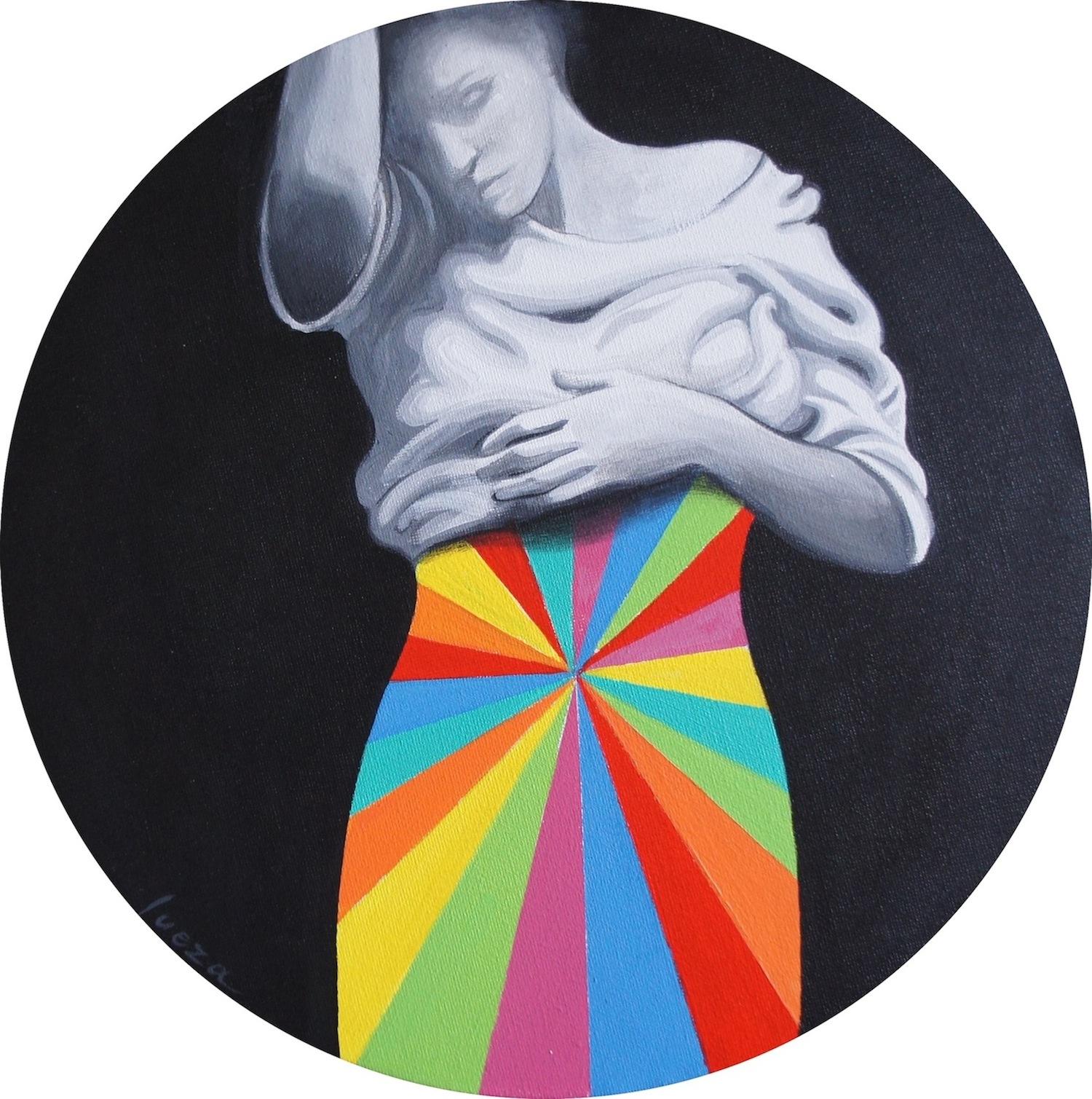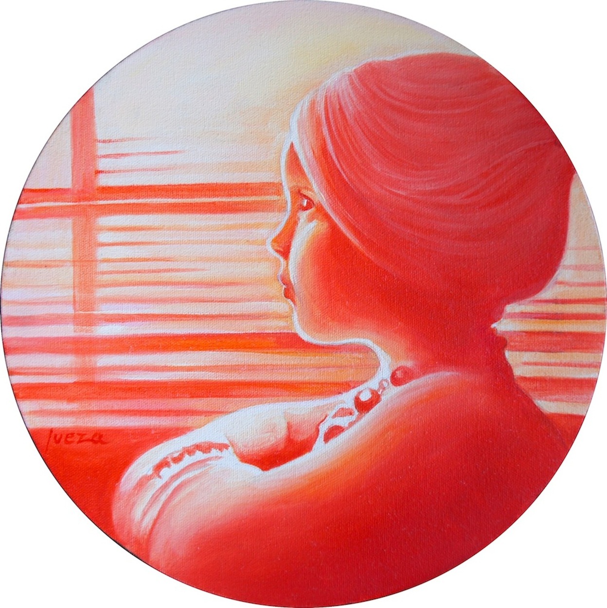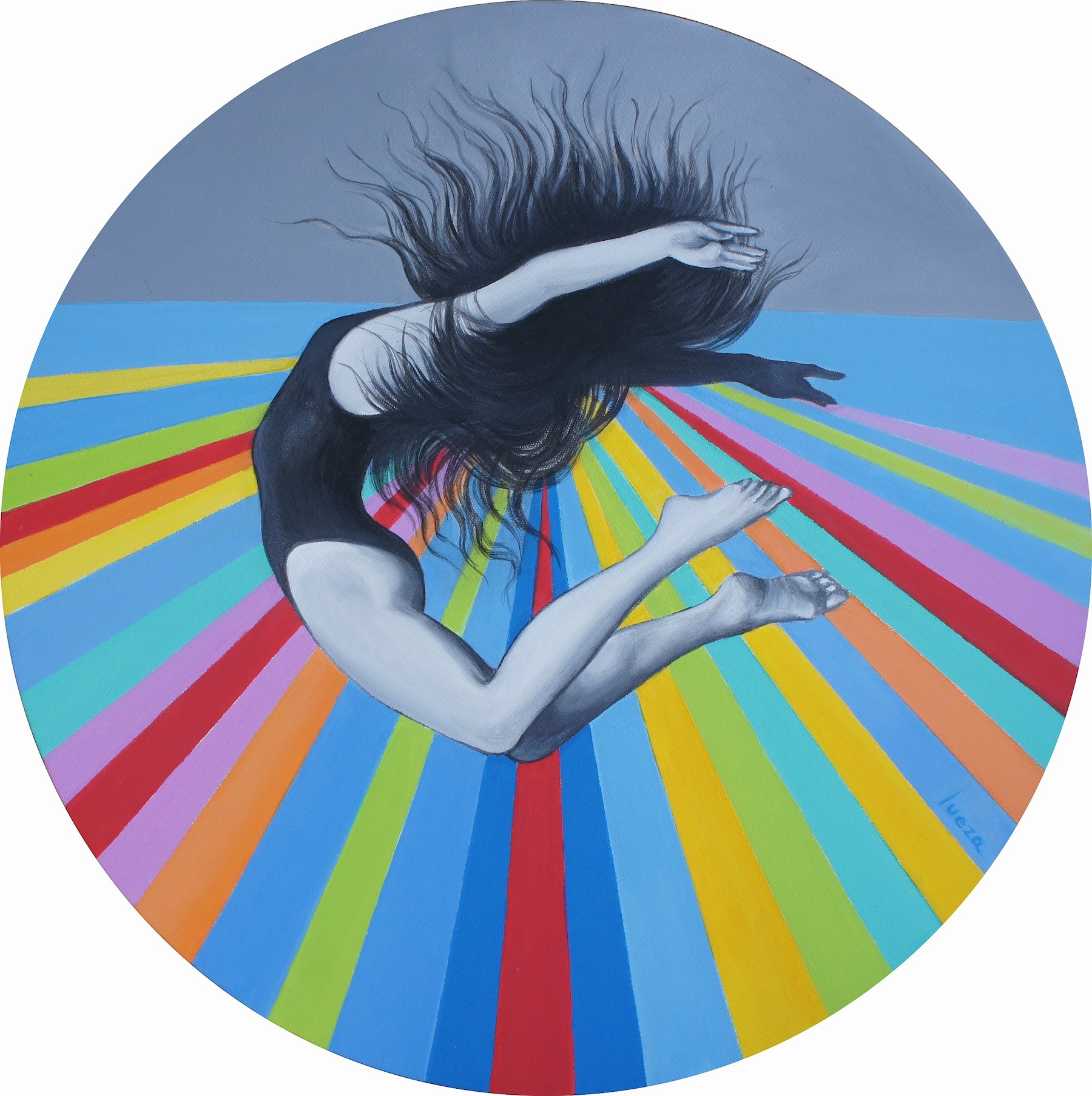 Las pinturas circulares de Lueza representan pequeños barcos de papel flotando sobre océanos turbulentos. Una de las telas revela la imagen de un hombre solitario observando lo que pareciera ser los barrotes de una celda. En otra tela, una mujer joven y desnuda cubre su rostro con sus largos y oscuros cabellos. Estas y otras imágenes estan intercaladas con ovalos negros de burbujas flotantes que la oscura silueta de una niña -pintada en el margen derecho- pareciera estar soplando a traves de la extensa composición.